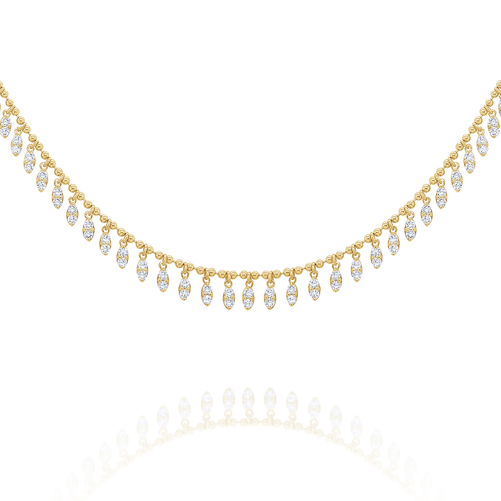 Diamond set marquis shapes swing freely below a golden chain creating a gorgeous fringe design. Chain is adjustable.