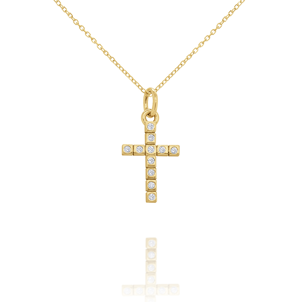Eleven diamonds set in small golden squares create a modern look to a traditional symbol of Christianity.