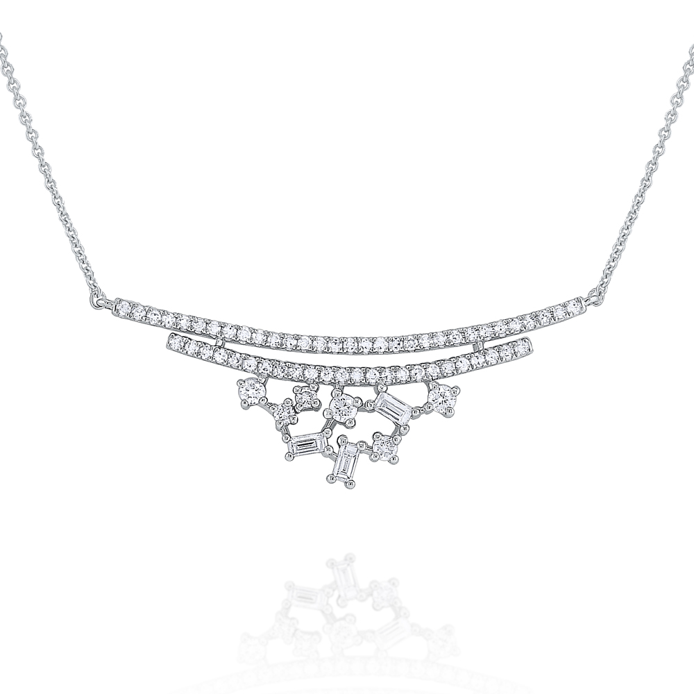 Light up your look in this chic necklace. Part of KC Designs Mosaic Collection, scattered shining baguette cut diamonds are set below two glittering curved lines.