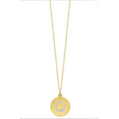 If you are looking for a subtle and elegant charm so that you can embrace the trend for personalized jewelry, why not treat yourself to this sweet and feminine Diamond disc initial "Q" necklace? The dainty circular charm is shown here in yellow gold and the "Q" initial is made with 21 glimmering and gleaming .09 ct tw diamonds.
