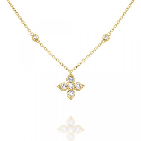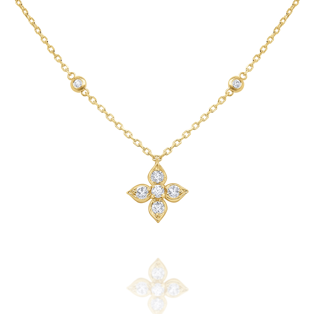 A diamond four petal flower hangs from a diamond accent chain. Pair up with earring style E9166
