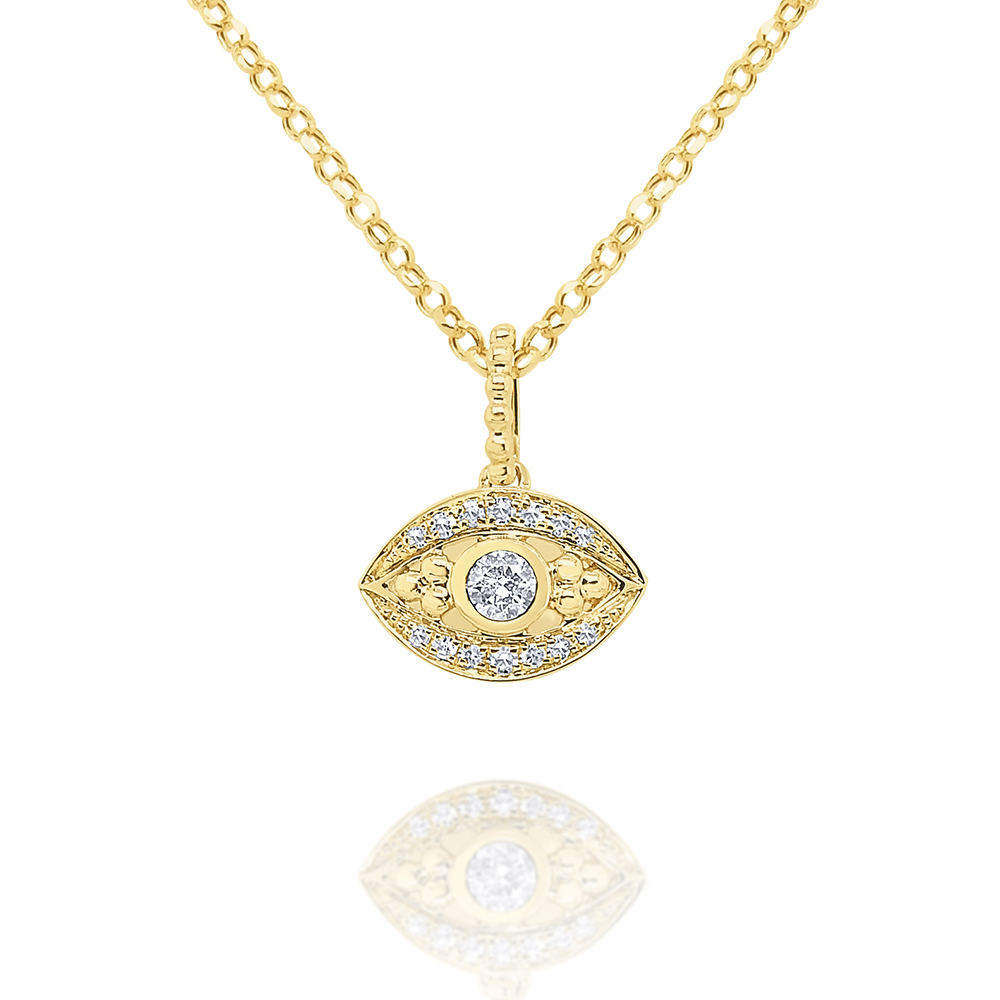 This gold and diamond evil eye necklace id the perfect addition to your other talisman designs.
