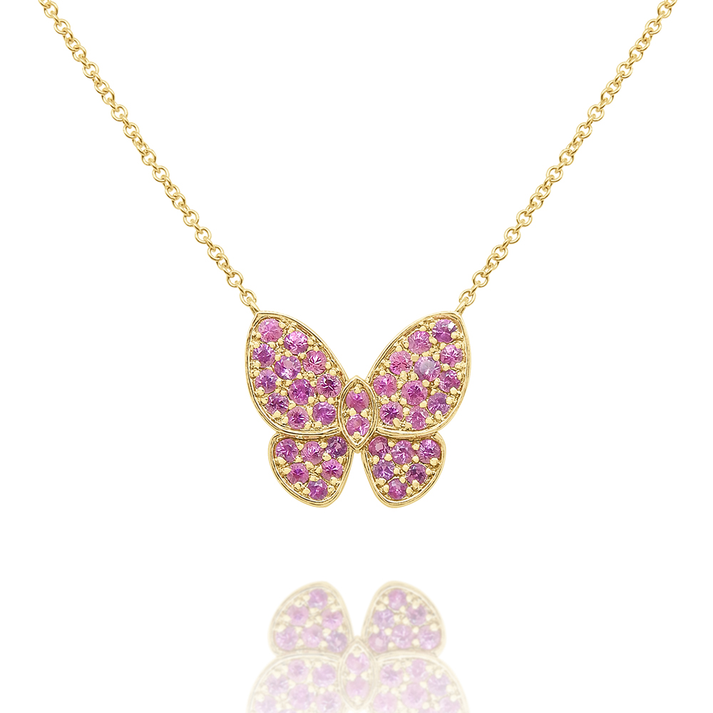 Electric pave set pink sapphires make up this beautiful butterfly necklace. The perfect accessory for spring.