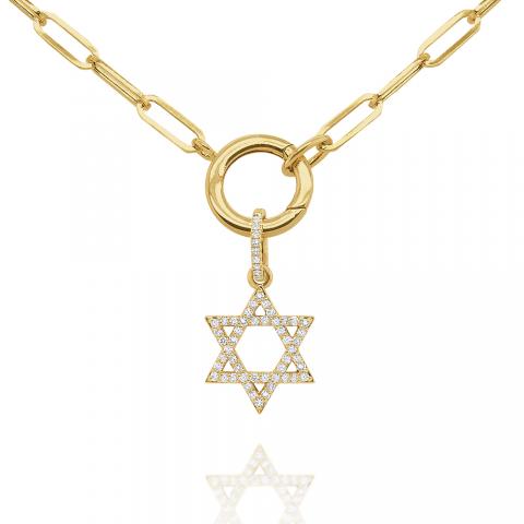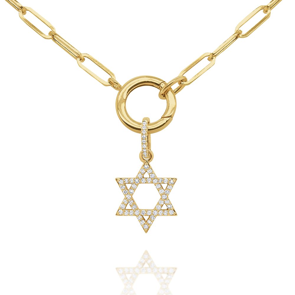 A glittering pave diamond Jewish Star charm hangs below a golden charm holder on a modern paperclip chain.