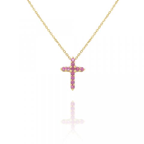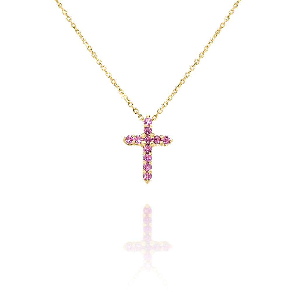 Show your faith with this beautiful 14k Gold and electric pink sapphire cross necklace.