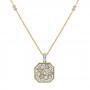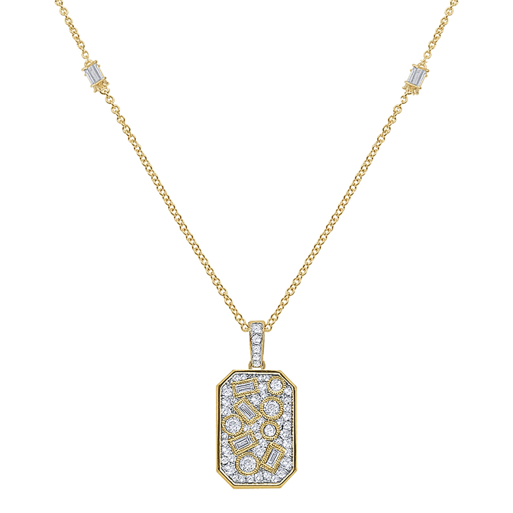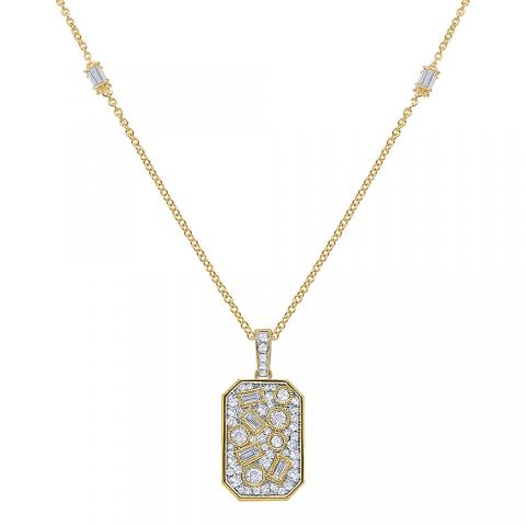 Pave diamonds surround baguettes forming a geometric mosaic pattern. A diamond accent chain makes this unique necklace even more stunning.