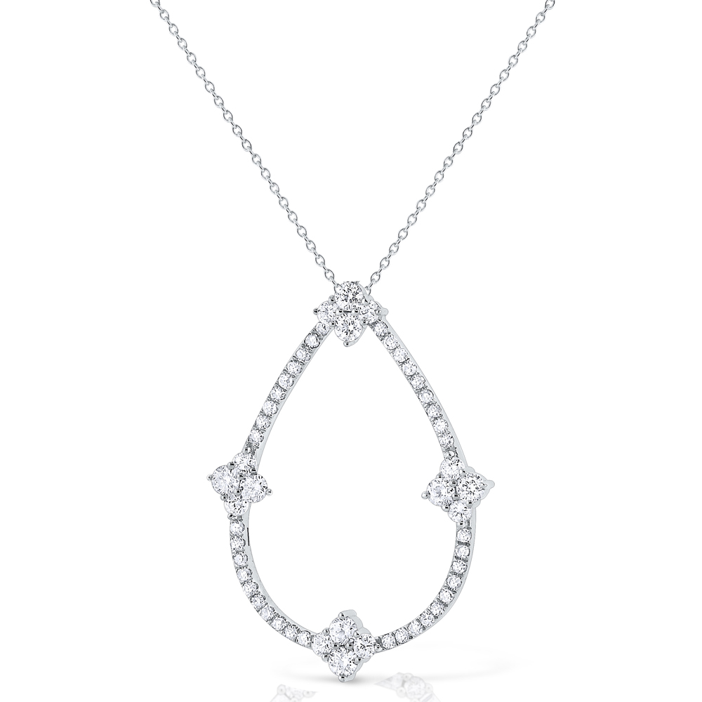 Diamonds set in gold dazzle in this open pear shape necklace accented with clover detail