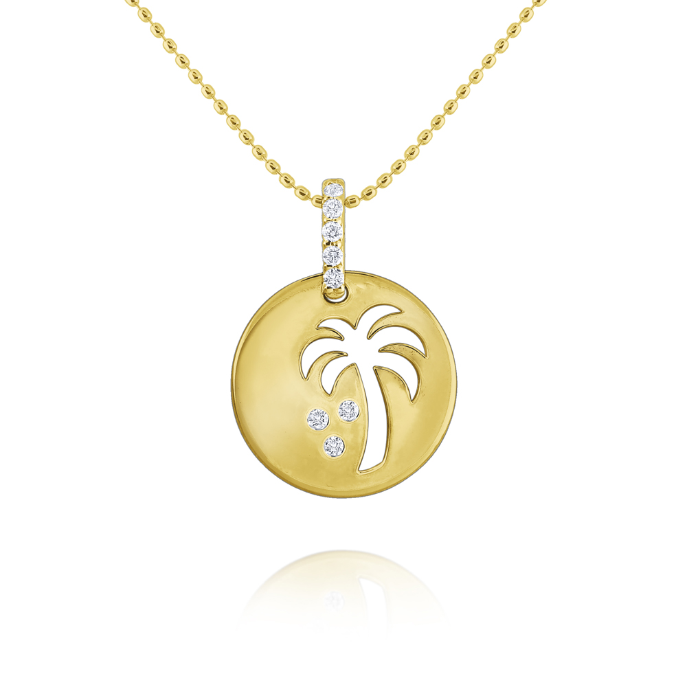 14k Gold Palm Tree Disc Necklace Accented with 9 dazzling diamonds.