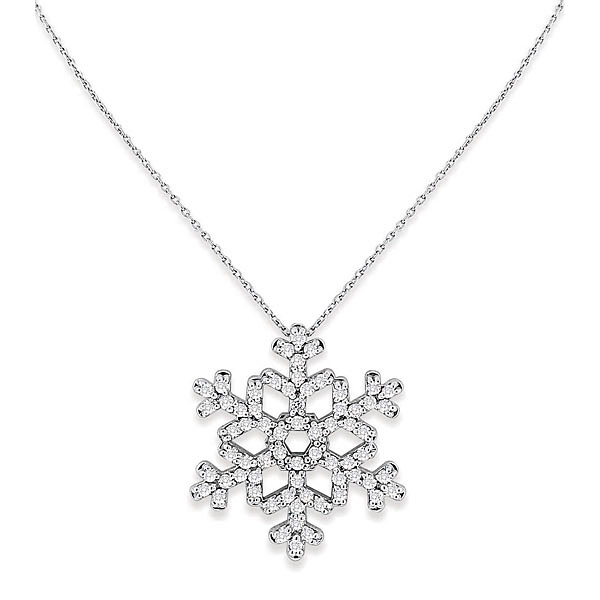 Winter is a beautiful and magical season, so capture the ephemeral beauty of a snowflake in this sweet and feminine diamond snowflake necklace. It sparkles with 66 twinkling and radiant .67 ct tw diamonds and unlike a real snowflake, it will never melt away. This beautiful necklace is shown here in 14 karat white gold.
