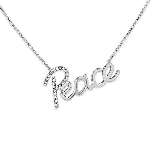 Express your desire for peace and harmony in the world with a gorgeous fashion statement piece of glittering diamond jewelry. Pictured here in white gold, this gorgeous diamond "peace" necklace is decorated with 23 little sparkling .10 ct tw diamonds decorating the letter "P". This splendid and exquisite necklace speaks for itself.