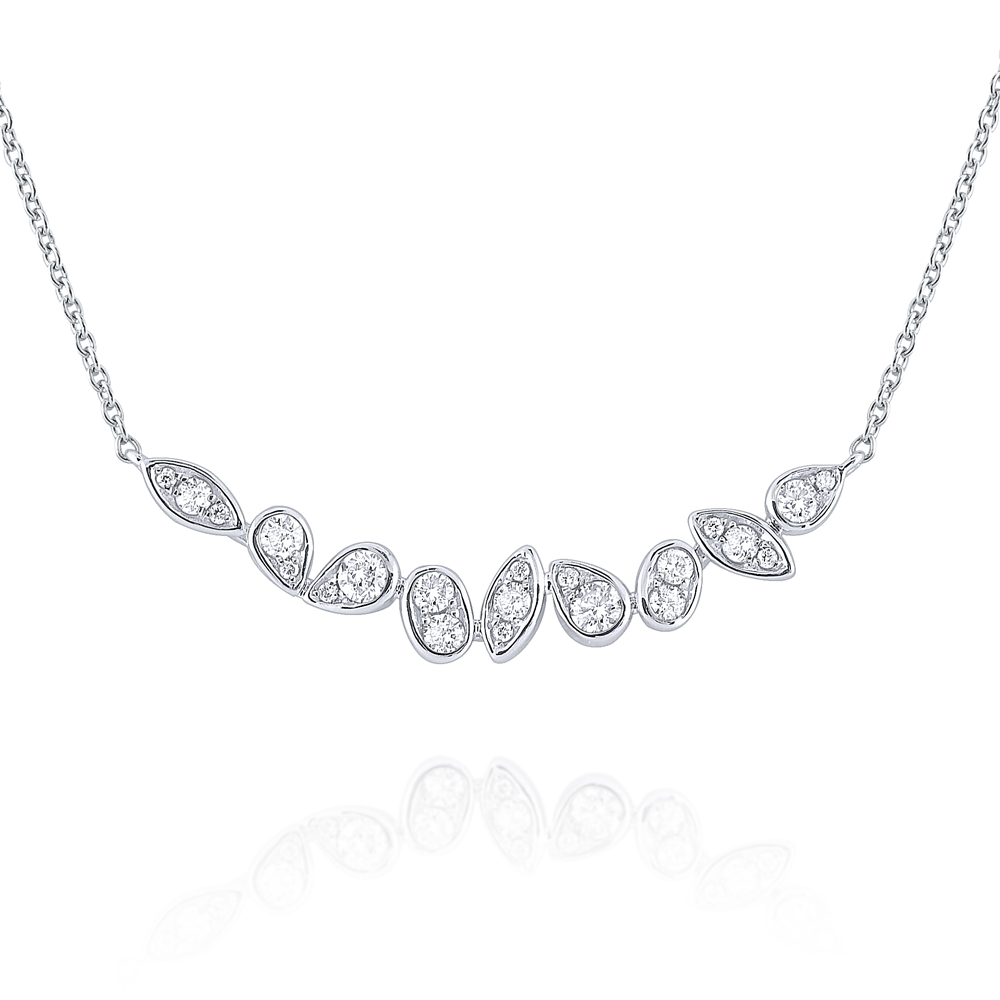 Just left of center…..a collection of diamond shapes form this updated version of the curved bar necklace.
