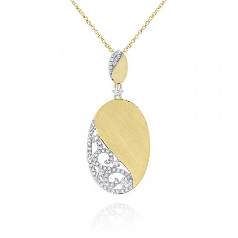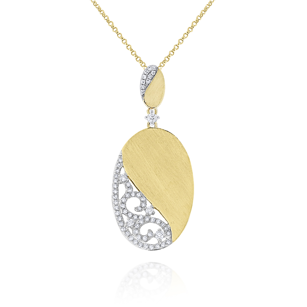 Diamonds sparkle and swirl in 14k gold oval pendant with a soft brushed finish for contrast.