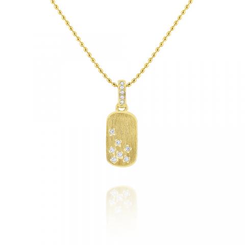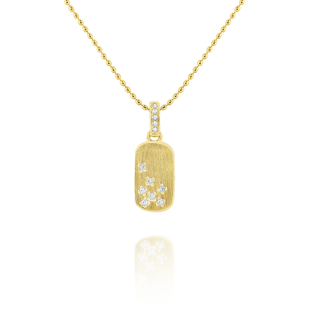 A scattering of diamonds on a gold tag with a soft brushed finish is a fresh new look for this season - and right on trend.