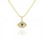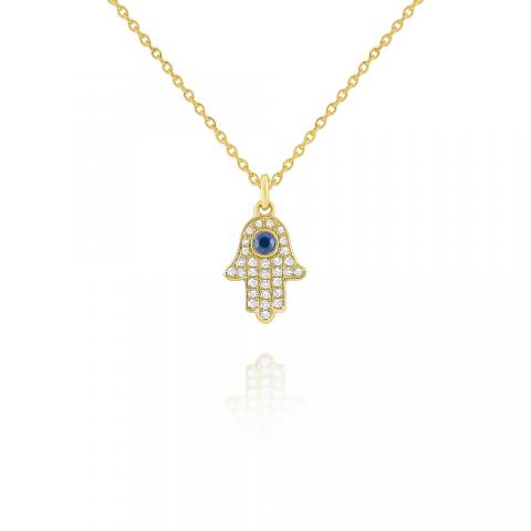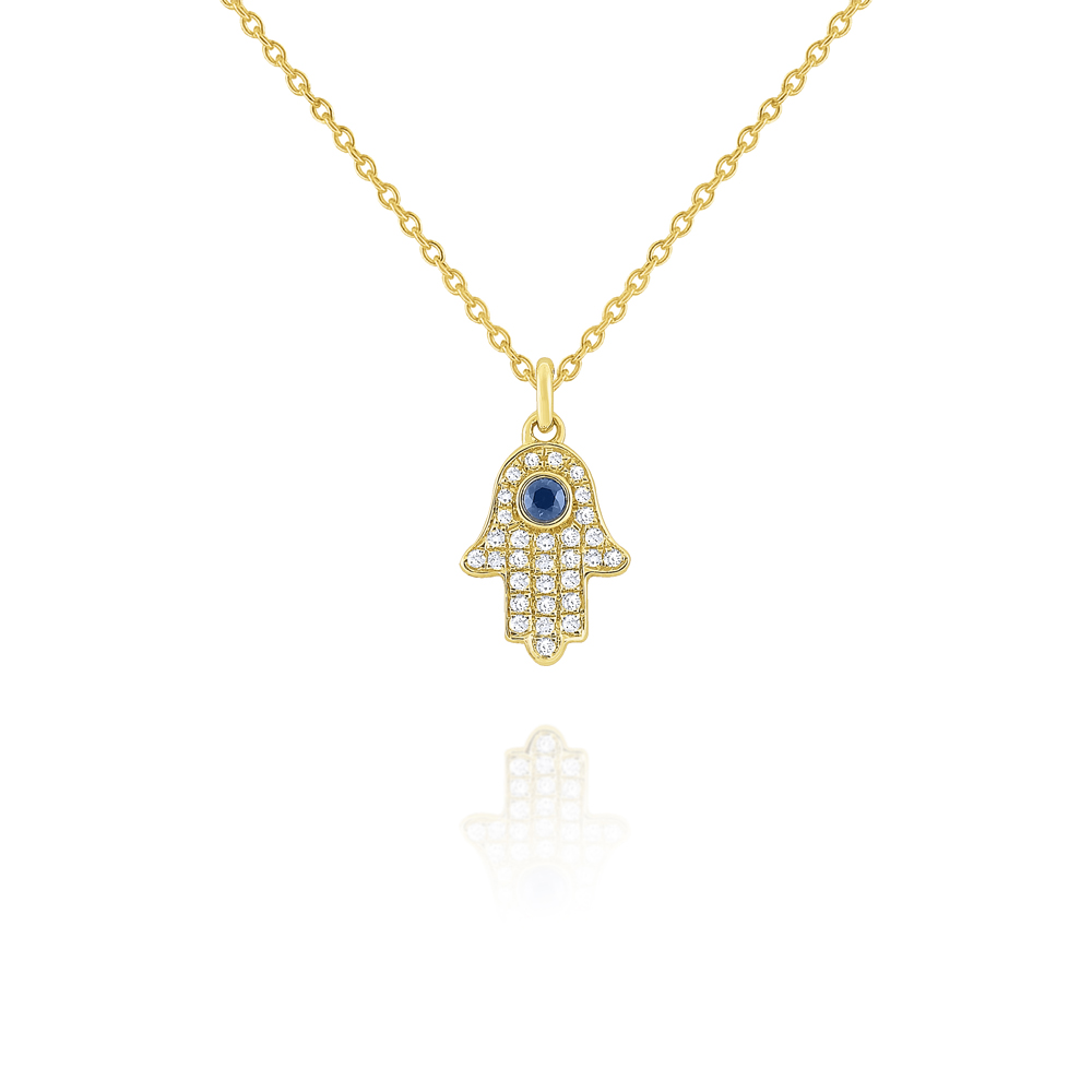 A single blue sapphire symbolizing the evil eye is surrounded by pave set diamonds in the shape of a hamsa bringing luck, heath and good fortune to its wearer.