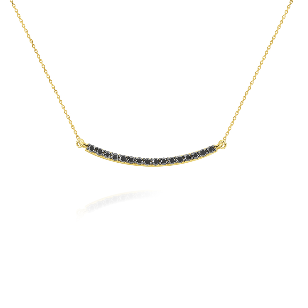 Yellow gold and black diamonds are an edgy combination. Wear it well with this curved bar necklace, with an adjustable 16,17 and 18" adjustable chain.