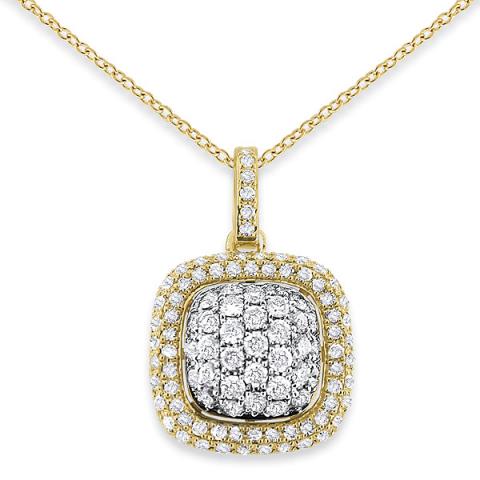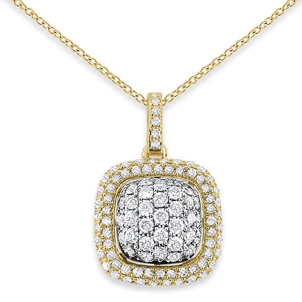 There are ordinary piece of jewelry and then there are stunning and dramatic pieces of jewelry like this one that really take center stage with their breathtaking boldness. This diamond square cluster necklace is absolutely stunning with its 103 radiant .61 ct tw diamonds and it's bold shape. It is shown here in yellow gold.