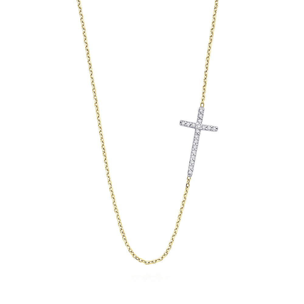This diamond cross necklace stationed to the right is a modern take on an age old jewelry tradition.