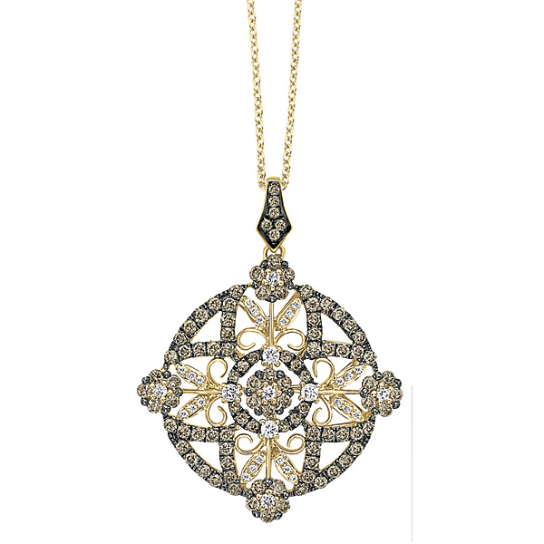This graceful and elegant white and champagne diamond necklace boasts a truly intricate and ornate design that is the result of superb workmanship and excellent attention to detail. It is pictured here in contrasting yellow gold and black rhodium and contains 132 stunning 1.56 carat total weight diamonds in its design.