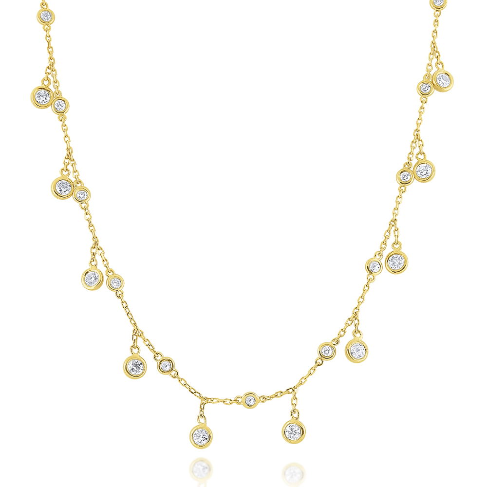 A new twist on the classic diamond by the yard necklace....diamond charms playfully move along a 17" golden chain.