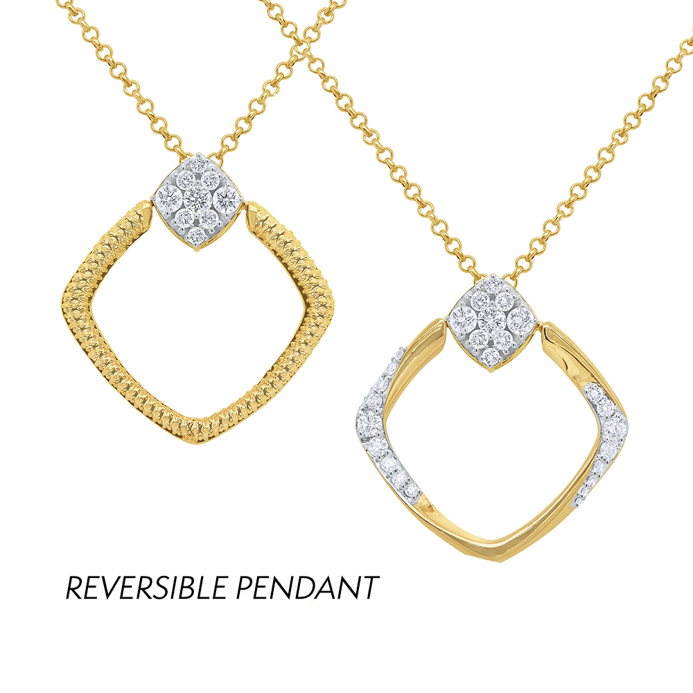 Flip the top of this modern gold and diamond pendant to reveal a second design....two great looks for the price of one.