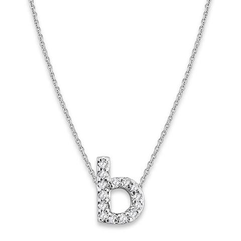 The trend for initial jewelry is so hot right now and the freshest and boldest look is a playful and flirtatious lowercase letter decorated with sparkling diamonds. This gorgeous diamond baby typewriter initial "B" necklace features 14 twinkling .08 ct tw diamonds and is pictured here in elegant and timeless 14K white gold.