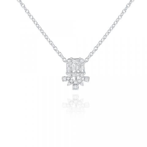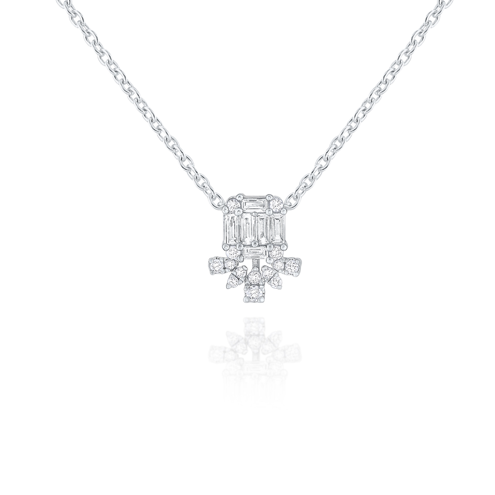 Round and baguette diamonds make up this adorable modern necklace on an adjustable chain. Pair with the matching earrings E9665.
