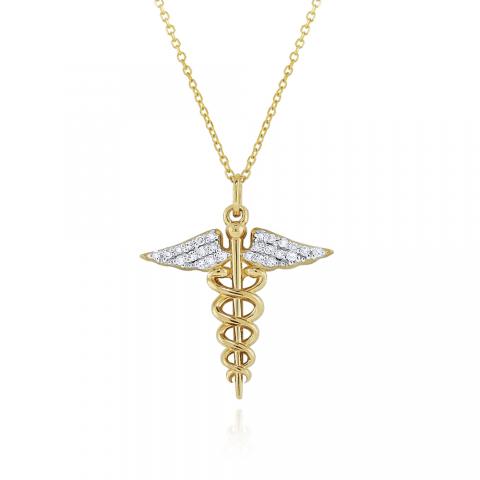 The Caduceus with it's two snakes and wings is a traditional symbol used in medicine. Here it shines in 14k gold with 26 sparkling diamonds on an 18" chain.