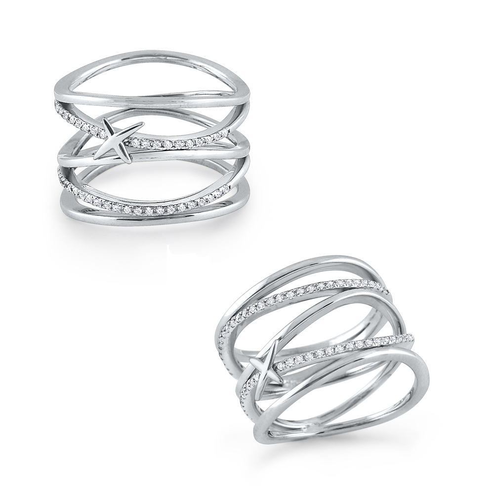 Multiple bands of gold and diamonds cross over each other to form this modern ring.