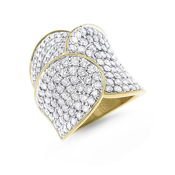 Make a big statement with this absolutely dazzling diamond fashion ring. Like a big fireworks display, it steals the show and captures everyone's attention. It contains 170 stunning 3.25 ct tw diamonds that dazzle and shine within an incredibly modern and chic design. This eye catching ring is shown here in 14 k yellow gold.