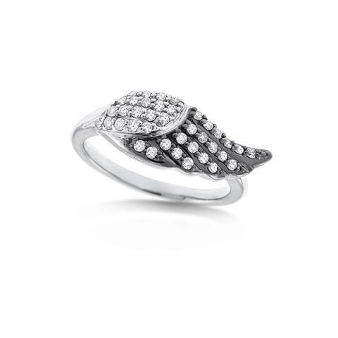 When you wear this diamond angel wing ring, everyone will think that you are so beautiful that you must be heaven-sent. This sweet and charming diamond angel wing ring contains 39 shimmering .32 ct tw diamonds on the elegant and classy ring design. This unique and stylish ring is shown in 14 k gold with black rhodium.
