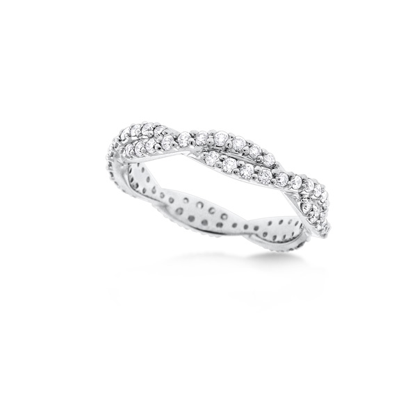 Two bands of diamonds and gold intertwine to form this elegant stack ring. Beautiful worn solo but striking when stacked with other bands.