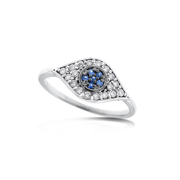 Sapphire And Diamond Evil Eye Ring in 14k White Gold with 24 Diamonds weighing .24ct tw
