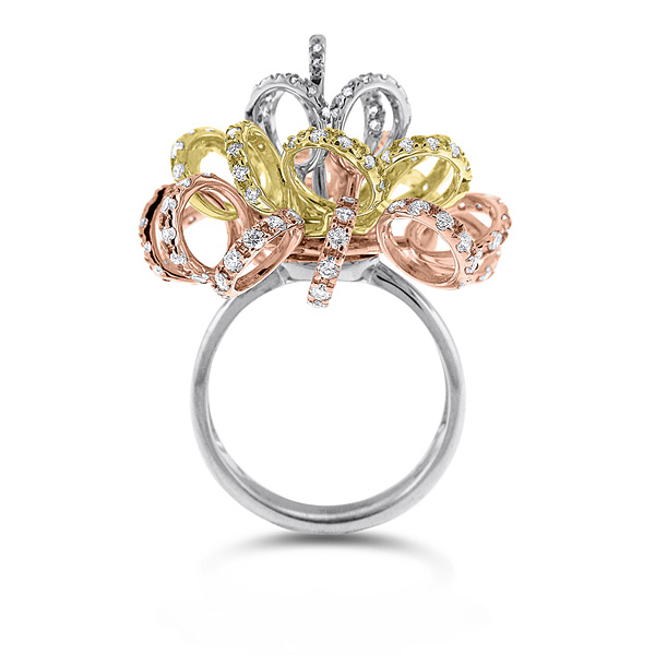 Do you really want to make a statement that will have all eyes on you and start a buzz? This diamond loops ring has such a unique and unusual design that it is sure to get people talking. It is opulent and radiant, featuring a complex display of loops featuring 161 radiant 1.37 ct tw diamonds. It is shown here in 14 K white, yellow and rose gold.