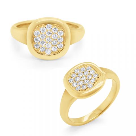 Pave diamonds in a cushion shape shine in this golden signet ring.