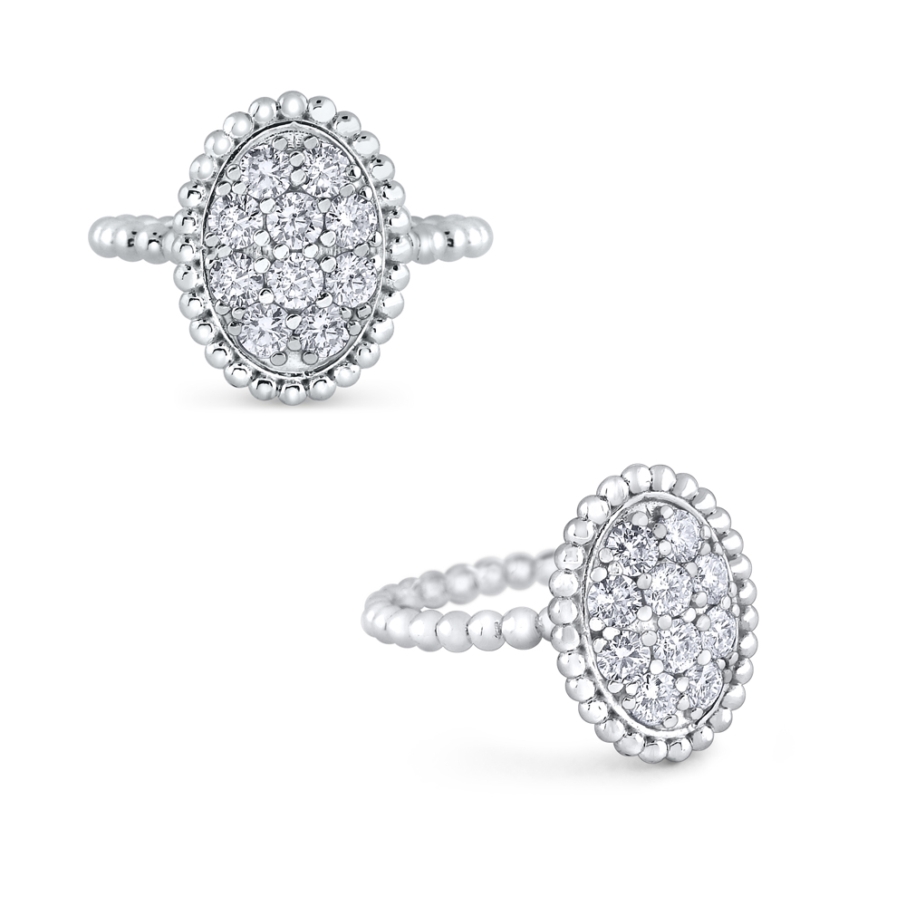Pave diamonds in a caviar oval setting shine atop a white gold caviar band adding a timeless and classic touch to this modern motif.