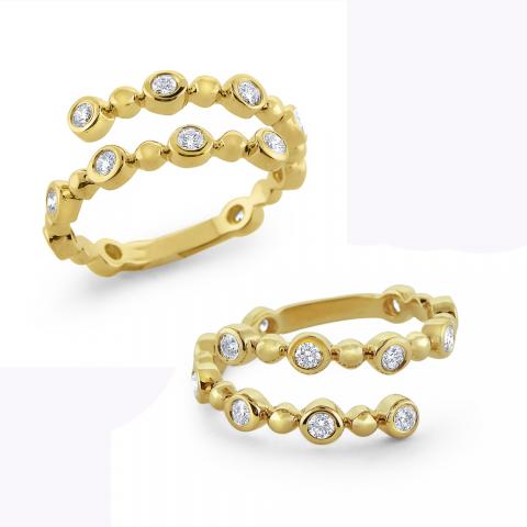 12 radiant diamonds set in a round bezel setting make for a slender wrap around ring perfect for gifting to your loved one…or even yourself!