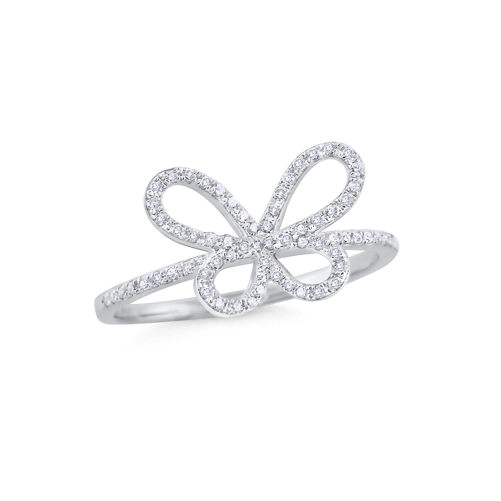 This open design work of a butterfly is shown with white pave diamonds atop a diamond band giving the piece that glimmer to be seen for miles!