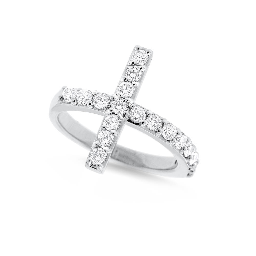 Diamond Side Cross Ring in 14K White Gold with 18 Diamonds Weighing .75ct tw