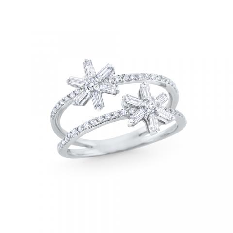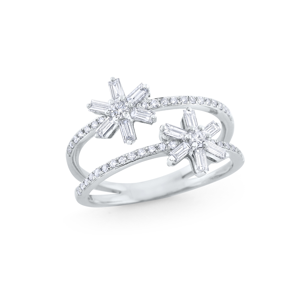 2 rows of diamonds are each accented with a floral mosaic piece by a mix of baguette and round diamonds.
