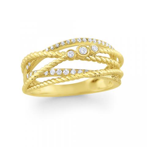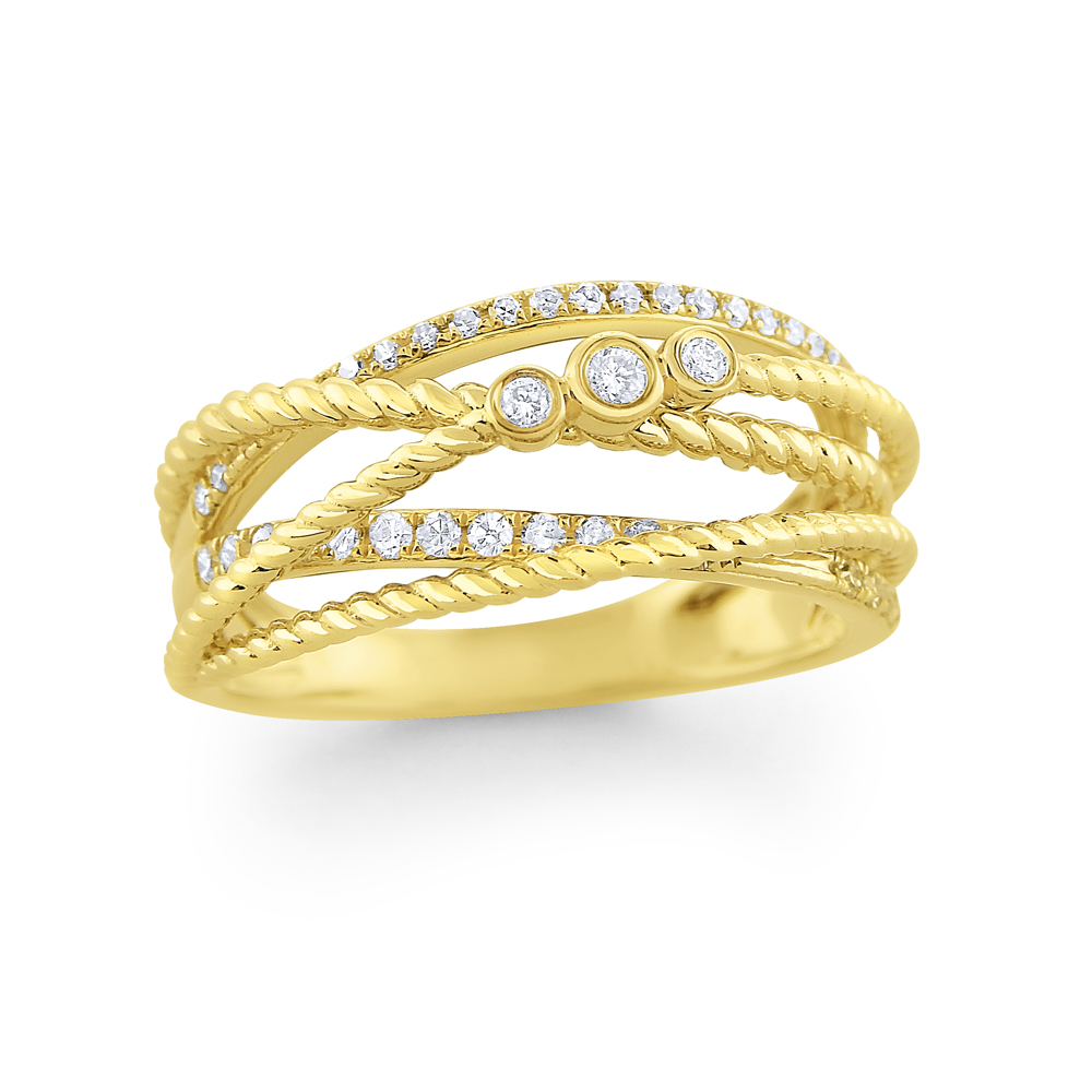 Intertwined gold and diamond bands make up this statement ring set accented with 3 bezel diamonds in the center