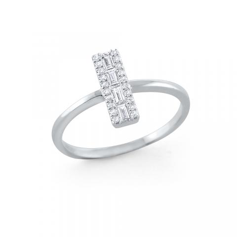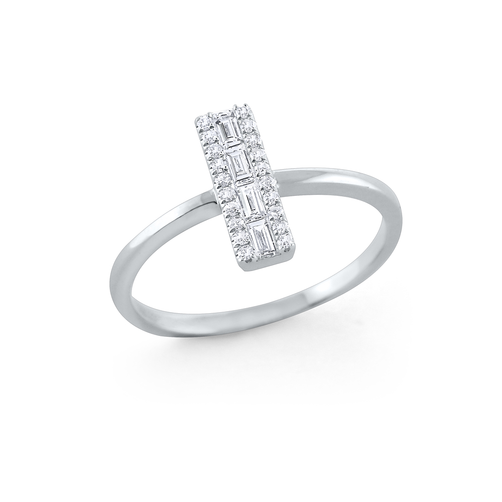 A mix of 24 baguettes and round diamonds form this modern rectangular mosaic design atop a 14K gold band.
