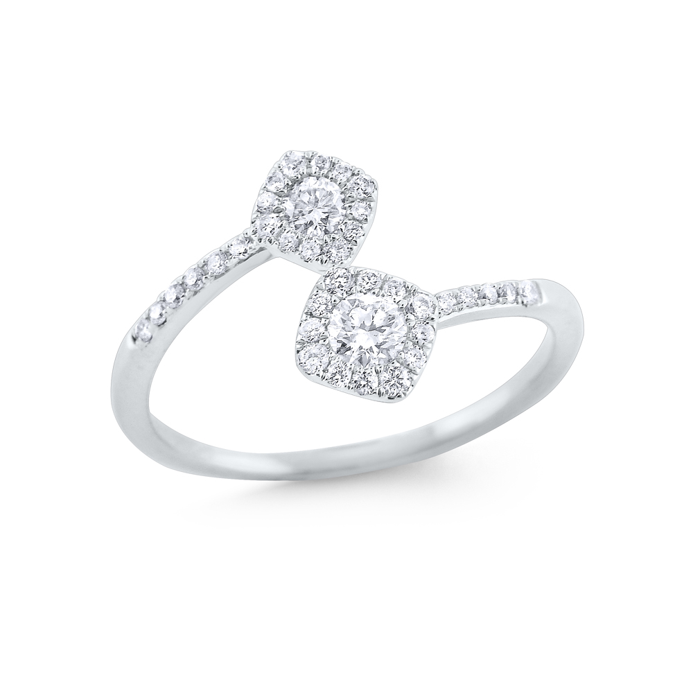 An elegant but simple bypass design ring using a cluster of diamonds to form a sparkling square shape.