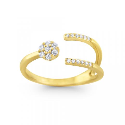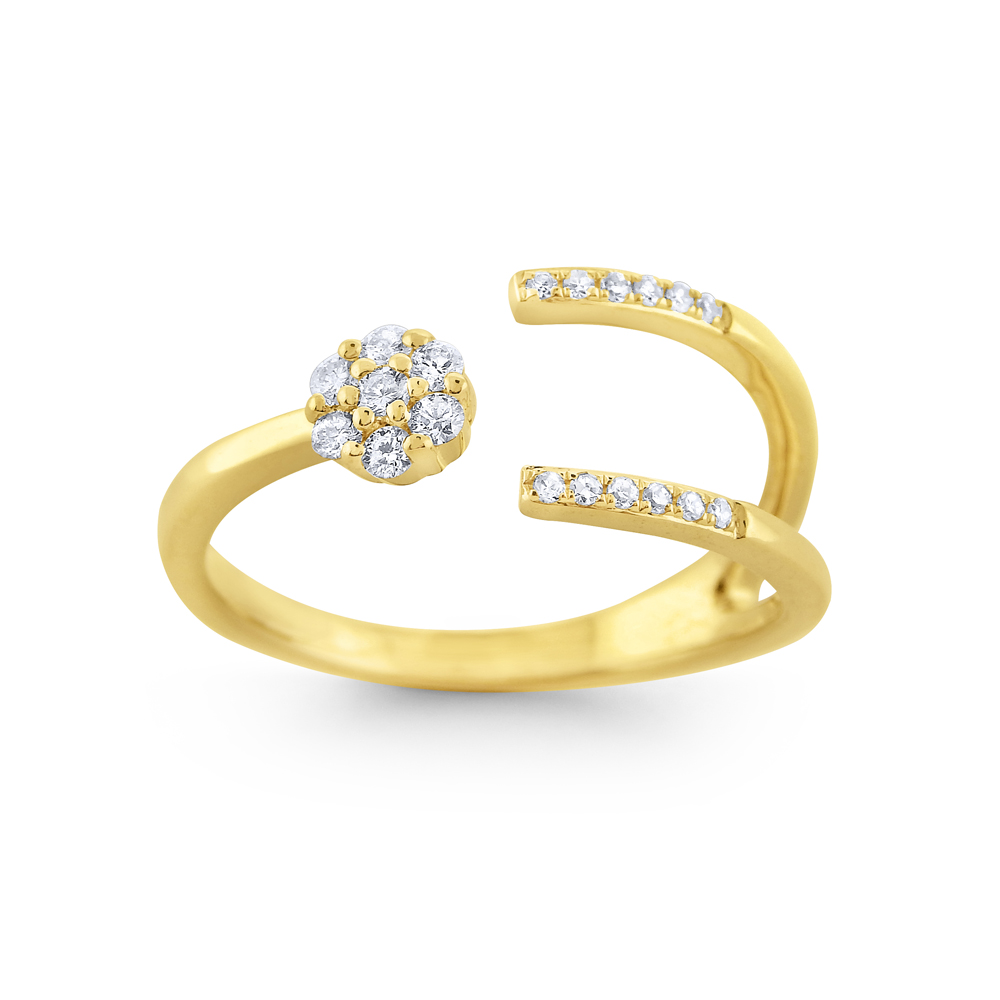 A circular cluster of pave diamonds sits opposite two diamond parallel bars. This contemporary piece ties in the current trends with timeless fashion jewelry.