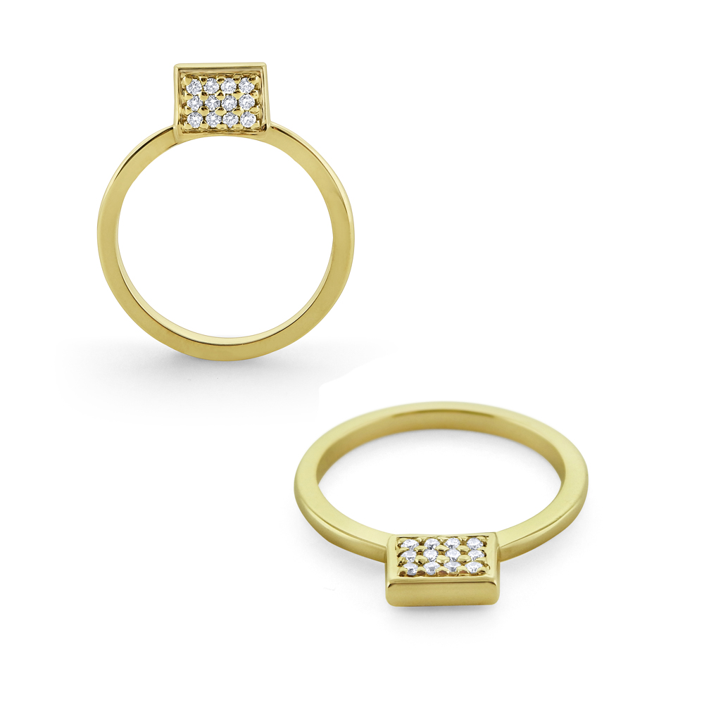 A slender yellow gold band is joined by a white diamond square atop the center of the ring creating a delicate design making it perfect for stacking.