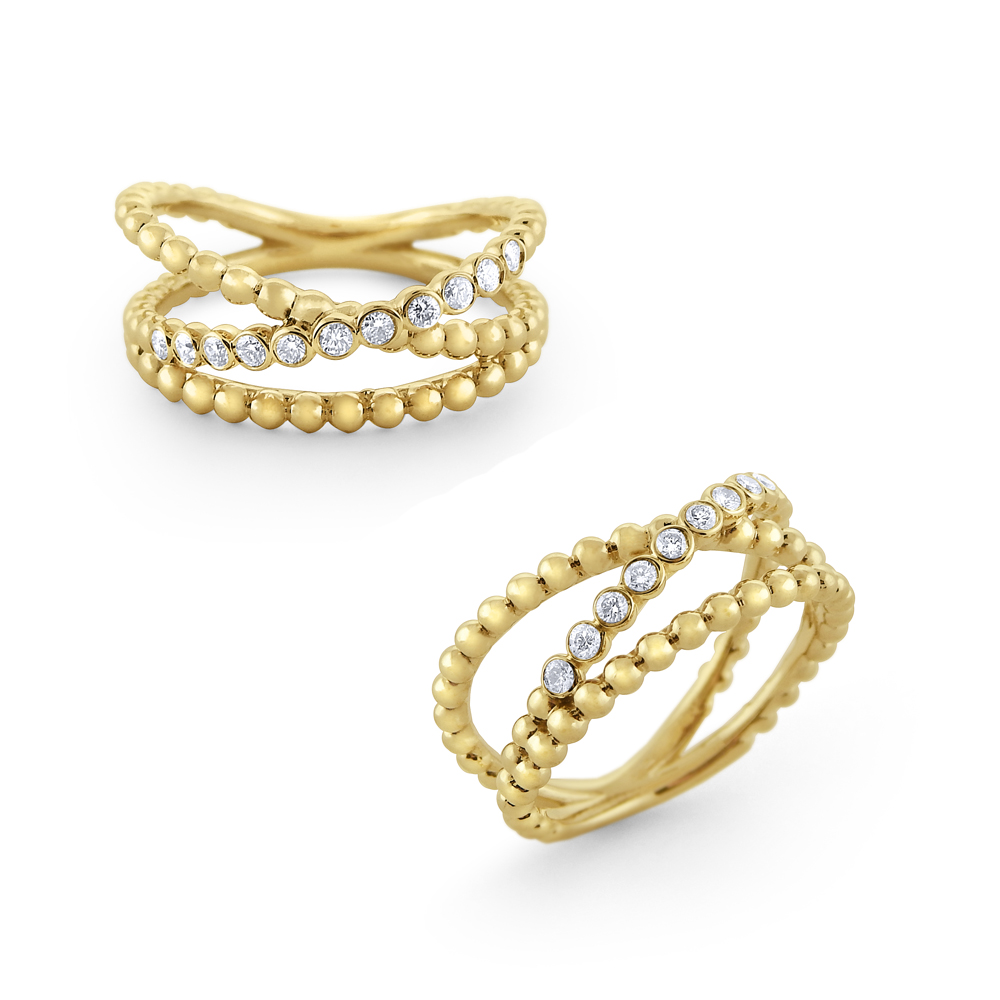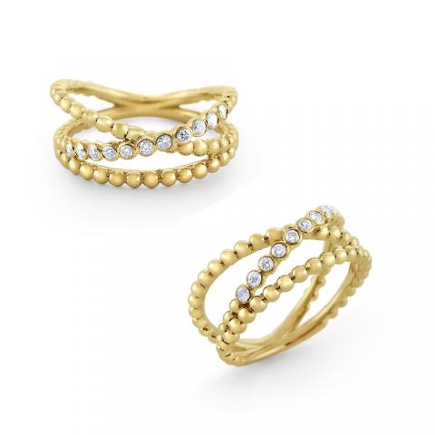 A two tone piece combined with a yellow gold beaded band meeting white gold bezel diamonds gives a unique touch and is perfect when pairing with your other KC favorite rings of any color!