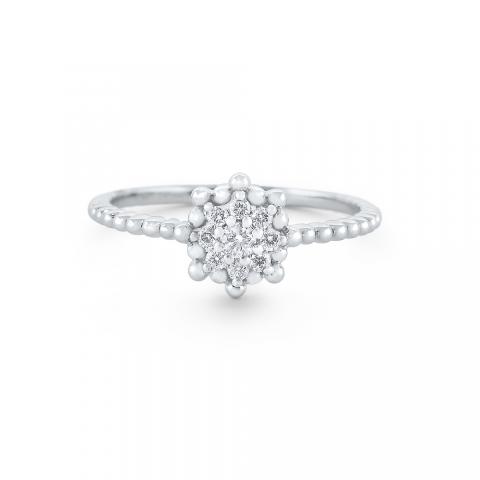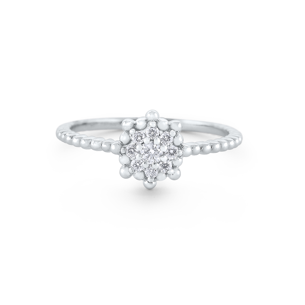 A diamond band serves as a chic foundation for a beautiful diamond cluster of diamonds that sweetly sit atop.