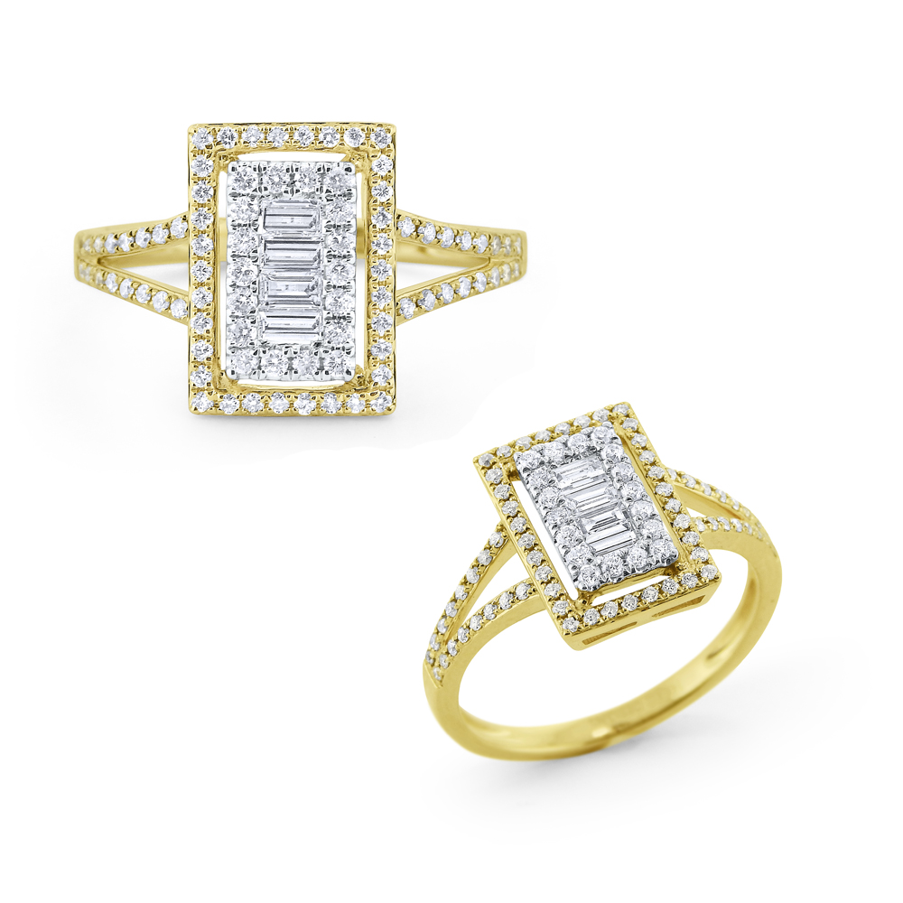 Baguette and round diamonds arranged in an elongated rectangular setting, outline by a single row of diamonds give you the glitz and glimmer style just like the stars in Hollywood.