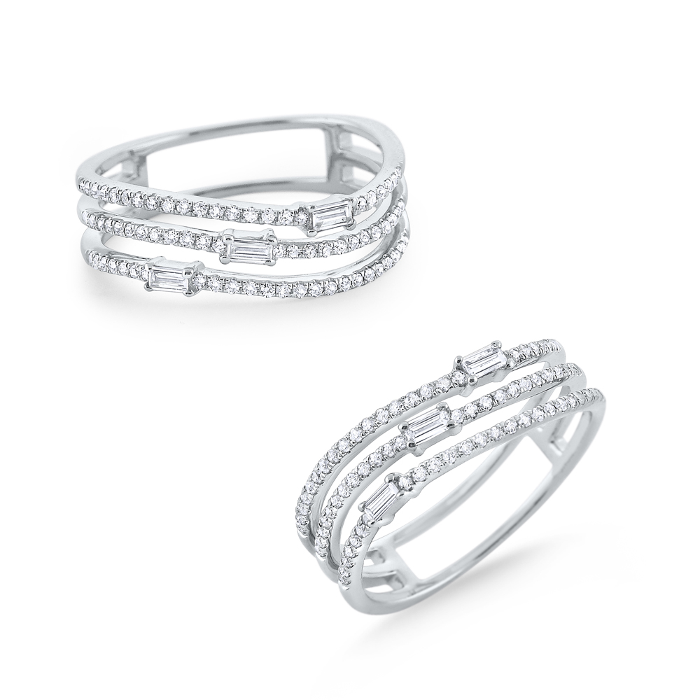 Part of KC Designs Mosaic Collection, this thee-in-one band evokes a feeling of movement. Sparkling round brilliant diamonds are paired with baguettes in an innovative wave pattern. Can be worn as a unique twist on the traditional wedding band, or as a chic fashion accessory.