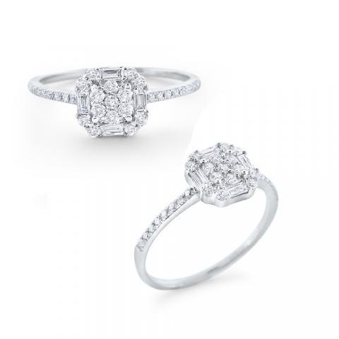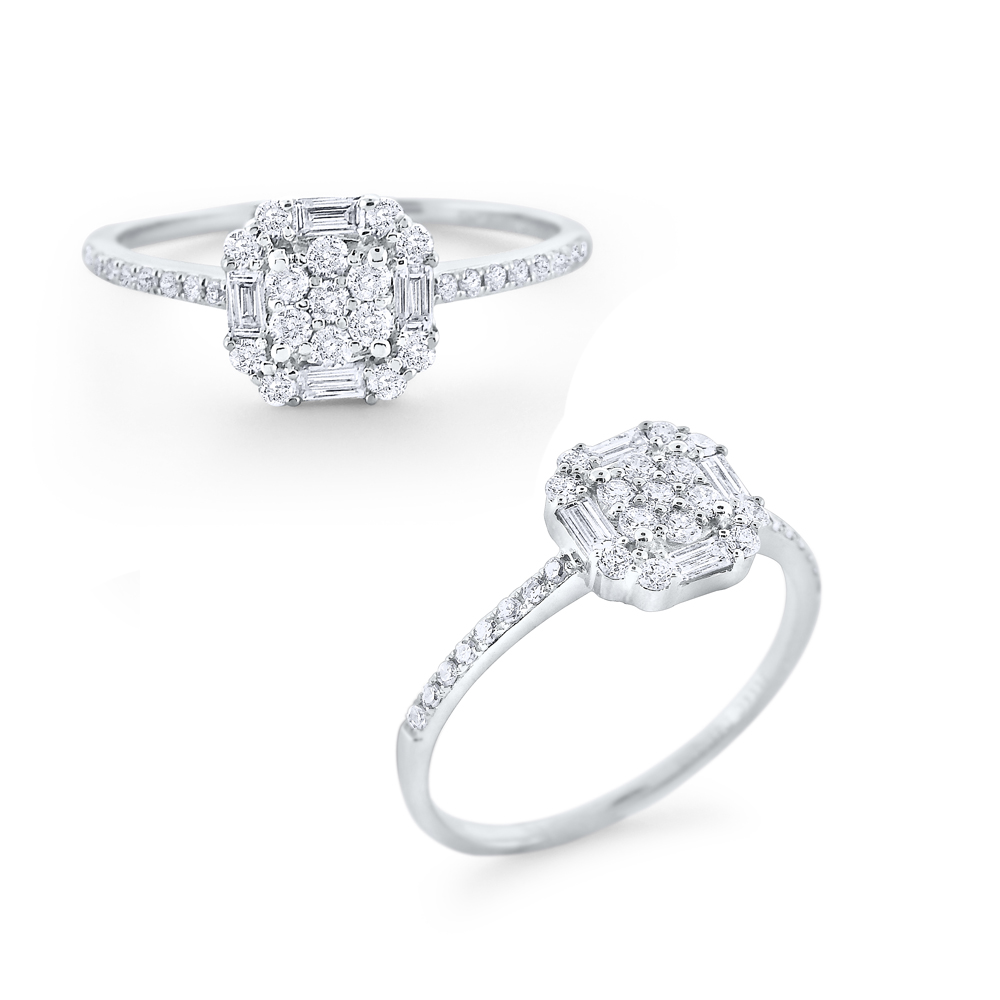 An array of baguette and round diamonds in a geometric shape a white gold and diamond band. A ring fit for a princess!