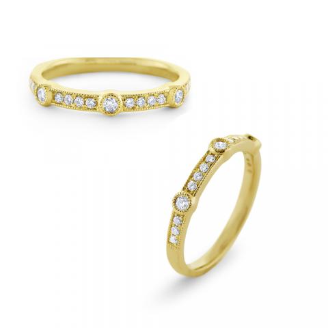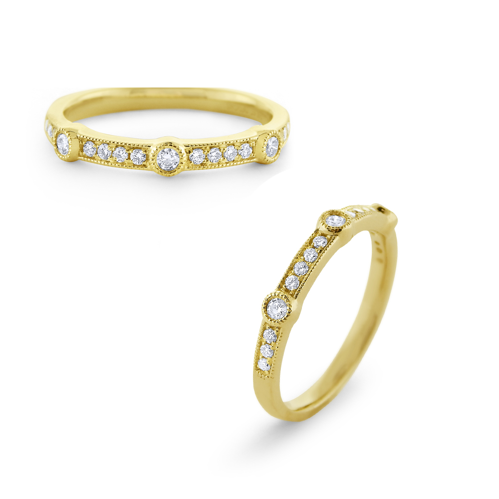 Three circular set bezel diamonds add extra sparkle to a sleek 14K gold diamond band. Stack white and rose gold together for that extra flare!